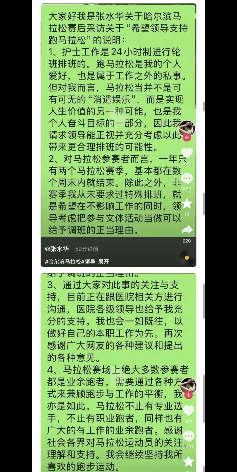 最快女护士张水华发声,跟医院各级领导沟通,会继续坚持跑马拉松